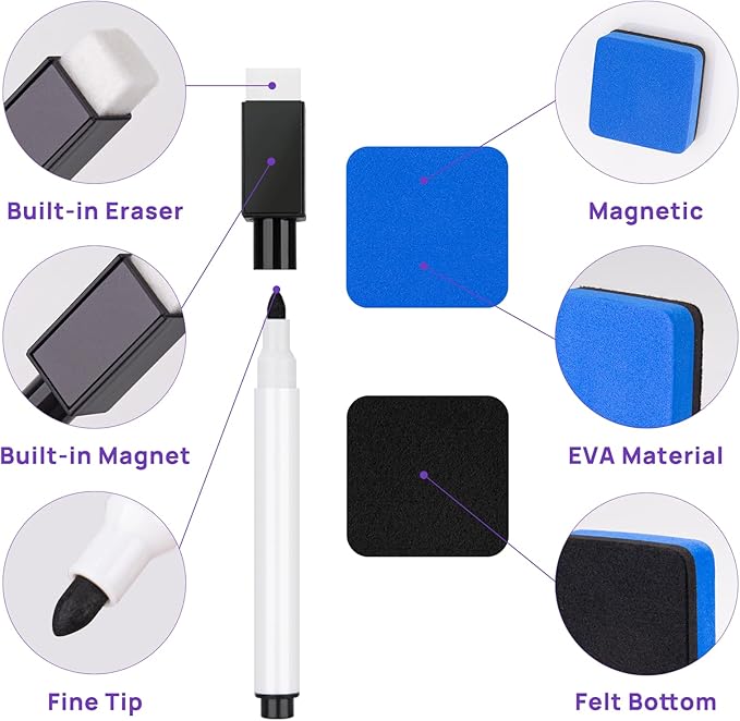 - Magnetic Cap & Eraser: The thin dry erase markers' cap equipped with magnet that can be stuck onto board long time without falling in order to reducing losing, also includes 2 magnetic erasers for convenient cleaning