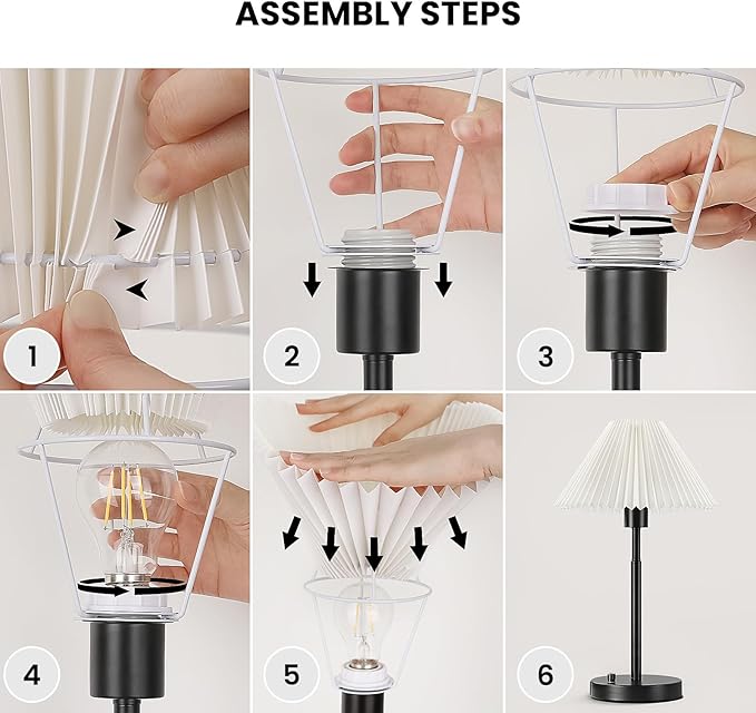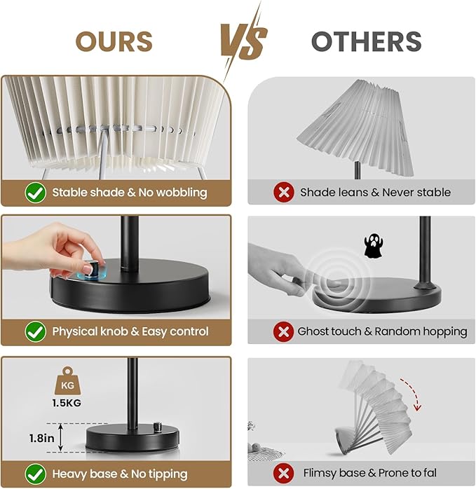 - Smooth Stepless Dimming & Soft Eye-Caring Light - Enjoy complete control over your lighting ambiance. The seamless stepless dimming allows you to rotate the knob to smoothly adjust the brightness from a warm, cozy glow to a bright, focused light for reading. The upgraded thick pleated lampshade projects a uniform and softened light, effectively reducing glare and minimizing eye strain for a more comfortable experience