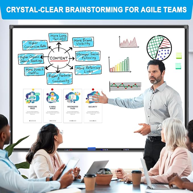 - ✔ Premium Durability – Unlike flimsy cardboard-core whiteboards, our sturdy wooden core resists warping, dents, and creases for long-lasting use. Black aluminum frame with ABS corner guards prevents dings.