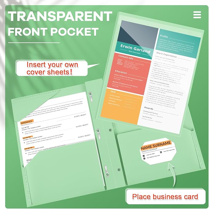 - Practical and Useful: with a clear front pocket, you can put your catalog, tables, favorite reports, presentations and more for clear display; Each plastic folder has 2 internal pockets to help organize and store your letter sized paper and documents, there are also 3 prongs to secure your 3-hole loose leaf paper, and the card slot can hold your ID card or business card, practical for your daily work