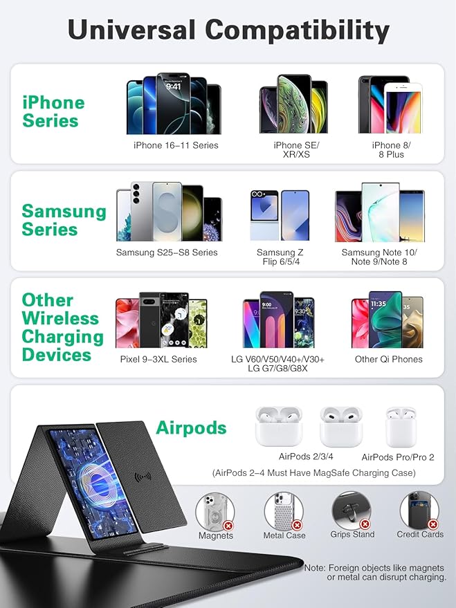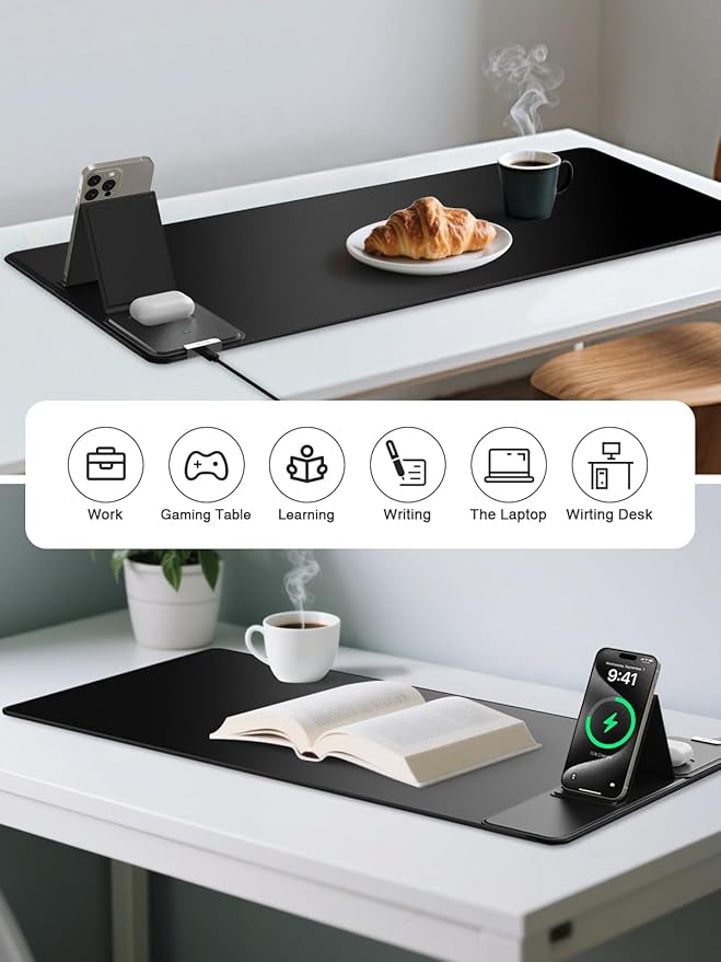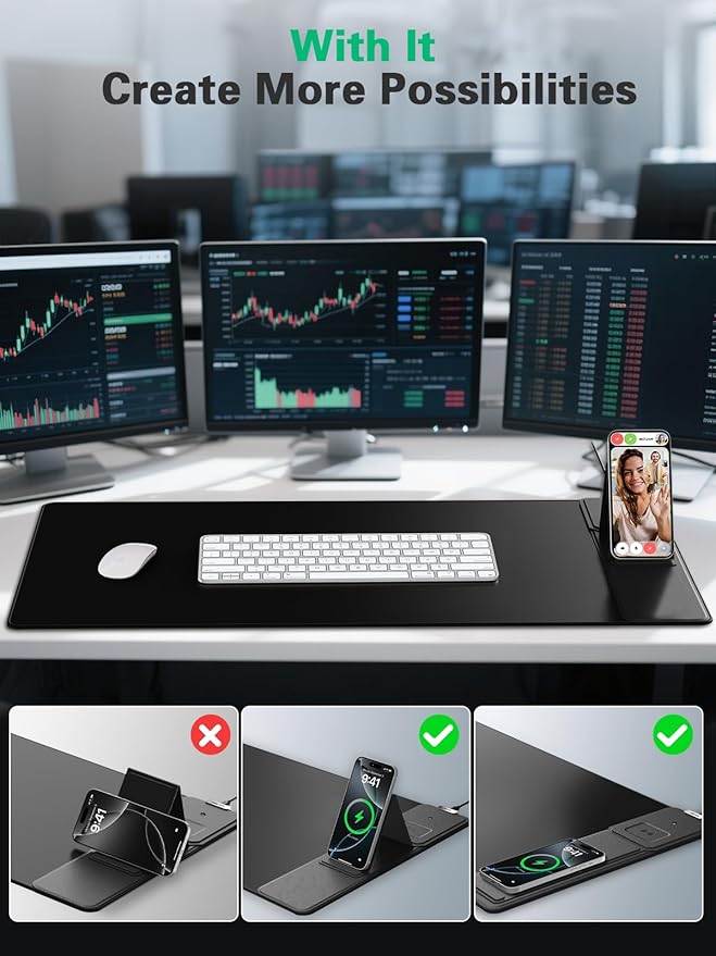 - ✅ Mouse Pad with Phone Holder: Mousepad built-in 15W fast wireless charging function. Compatible with iPhone 17/16/15/14/13/12/11/X/XR/XS/8 series, Samsung Galaxy S23/S22/S21/S20/S10/S9/S8/Note 9/8 and other smartphones that support wireless charging; Airpods 3rd/ Airpods Pro 2nd/Airpods Pro and other Qi enabled devices. (Note: 15W fast charging requires 18W/20W Power Adapter, which is not included in the this Mousepad.)