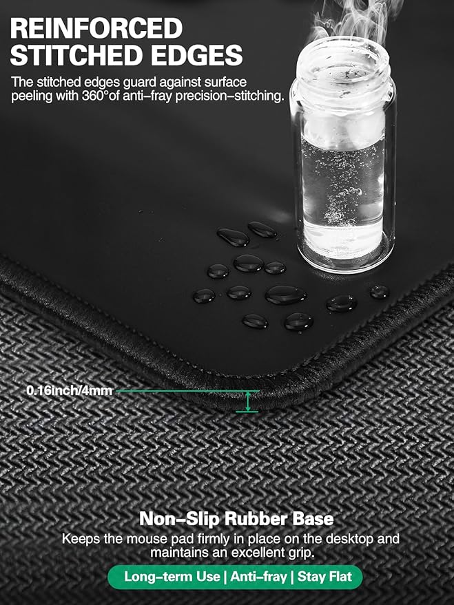 - ✅ Superior Control Surface: Extended mouse mat adopts textured micro-weave cloth surface on cover with enhanced command to provide the excellent balance between glide and control. The performance-tuned surface optimizes mouse tracking accuracy for both optical and laser sensors. Achieving optimal results in terms of precision and smoothness. Special non-slip design with 4mm thick for comfort, and increase friction resistance with the desktop. The friction resistance is increased by 70% than that of leather desk mat.