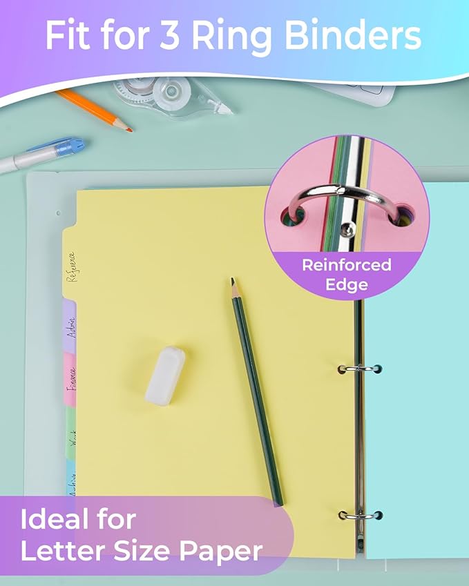 - Vibrant Colors: Featuring 5 beautiful colors per set, our 3 ring binder dividers brighten your workspace while simplifying organization. Easily navigate your materials and stay organized with these eye-catching, functional tabs