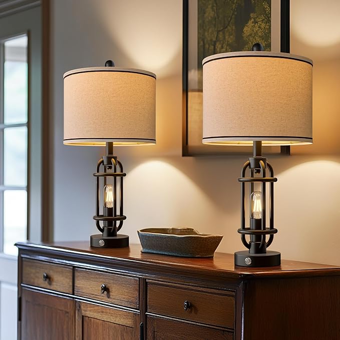- Versatile Table Lamps: Crafted with heavy-duty metal and premium linen shade, this table lamps for living room blends industrial lamp design with vintage lamp charm. This bedside lamps warm, glare-free light elevates any space—perfect as a living room lamp centerpiece or cozy bedside table lamp bedroom lamps set of 2