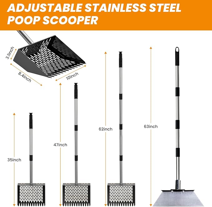 - ✅【ADJUSTABLE TELESCOPING HANDLE】Clean comfortably at any height with the stainless steel telescoping handle. Whether you’re scooping inside a small coop or across a large run, the extended reach saves your back.