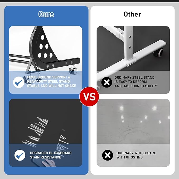 - 【Sturdy & Easy to Move】Constructed with heavy-duty steel framing and smooth-rolling lockable casters, this blackboard stands securely yet remains effortless to maneuver. Its sturdy base prevents tipping, while the lockable casters ensure stability when needed, making it a breeze to set up or reposition as required.