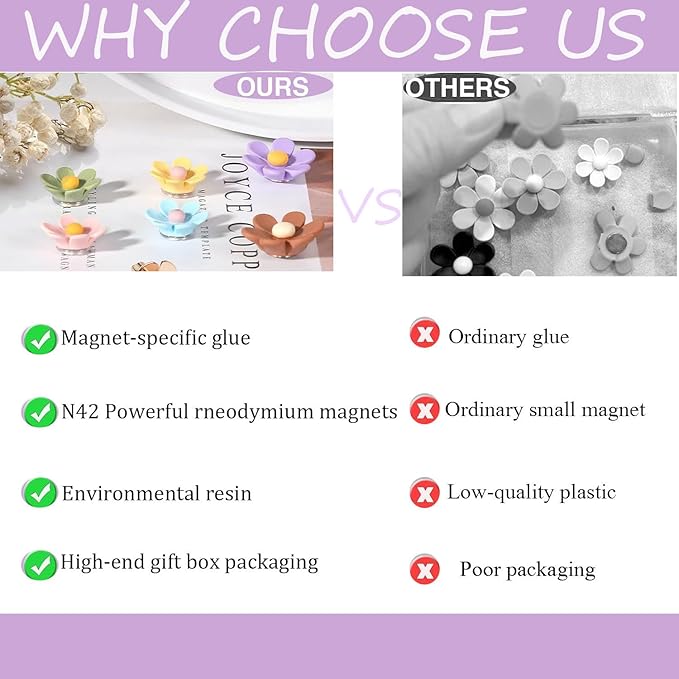 - Strong Magnet: The 3D flower fridge magnets are made of N42 Powerful rneodymium magnets , Environmental resin and Magnet-specific glue.They are handcrafted with exquisite quality.These fridge magnets are strong and will not break or fade.They are strong enough to hold 4 papers and never slip or fall again.Stronger magnet guaranteed